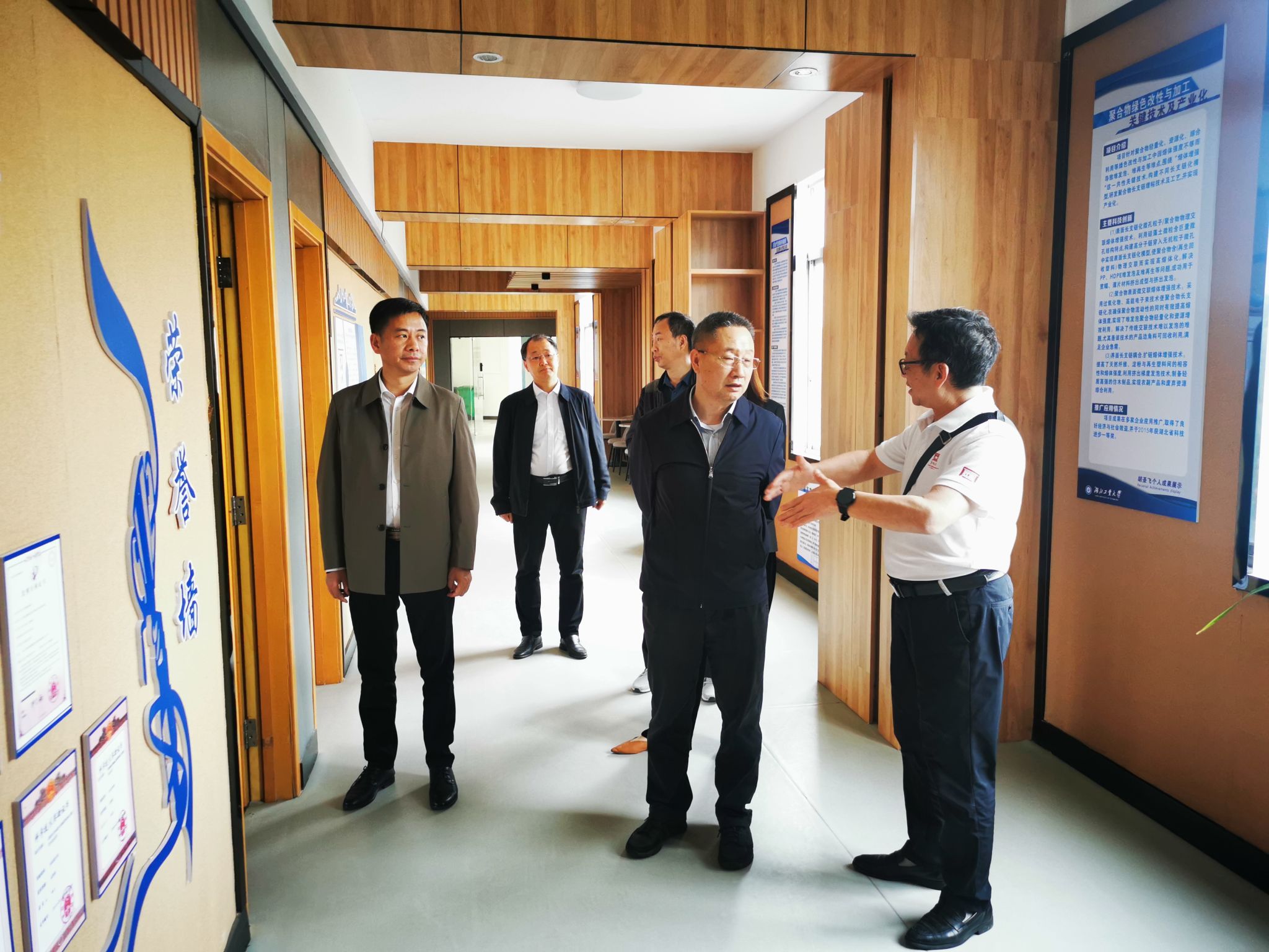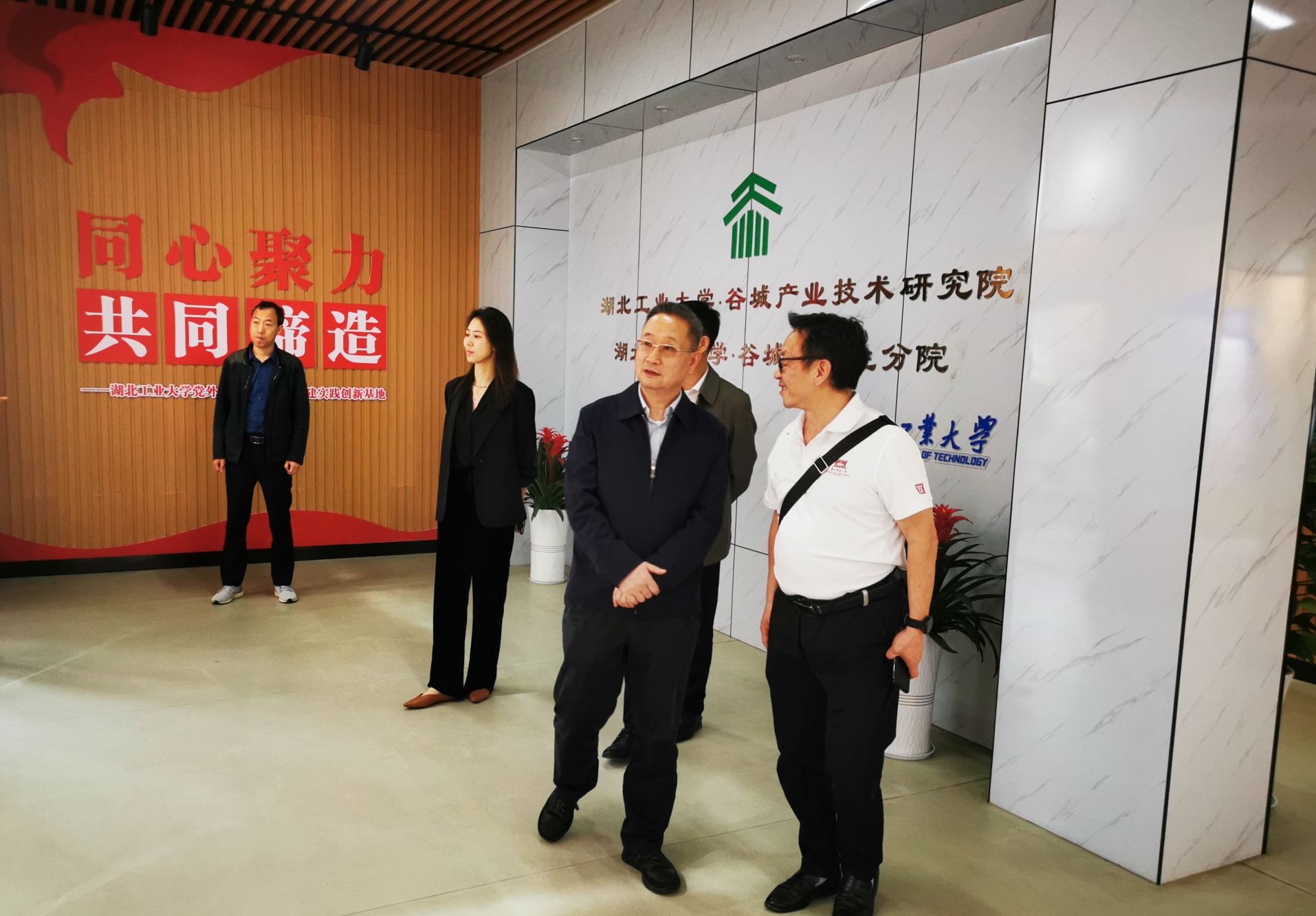 在湖北工业大学谷城产业技术研究院,彭育园书记一行参观了湖北工业大学与谷城县校地合作发展成果展示厅。湖北工业大学谷城产业技术研究院院长李伟南教授向彭育园书记一行详细汇报了谷城产业技术研究院运行和发展情况。